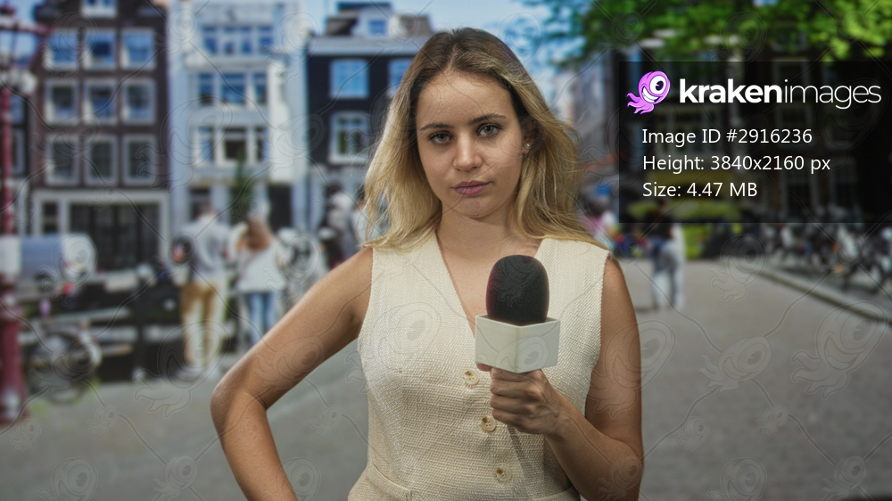Young blonde woman reporter holds microphone with hand on hip on city street by canal buildings and bicycles; confident reporting.