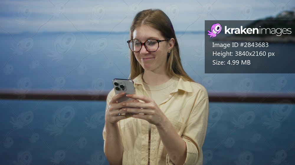Young blonde woman scrolls smartphone and smiles at screen while standing by calm ocean at beach; serenity connection communication.