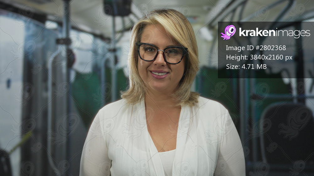 Young blonde woman scrunches lips, tilts head and raises eyebrow inside a bus on a busy street; playfulness.