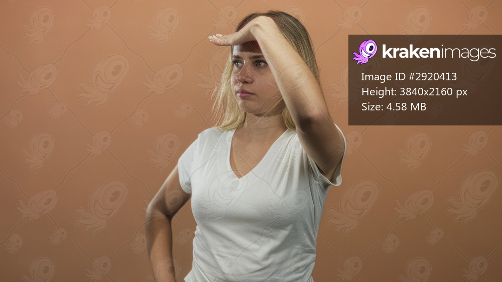 Young blonde woman shielding eyes with hand in peach studio while squinting and looking into the distance, wearing white t shirt; curious.