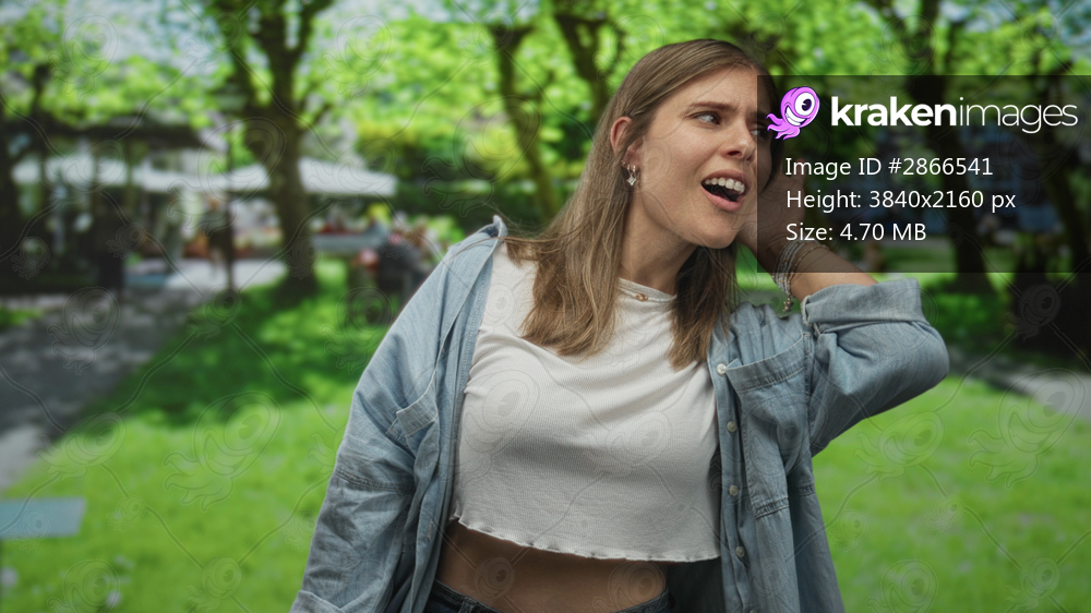 Young blonde woman shields face with hand in green forest setting under bright sunlight; discomfort.