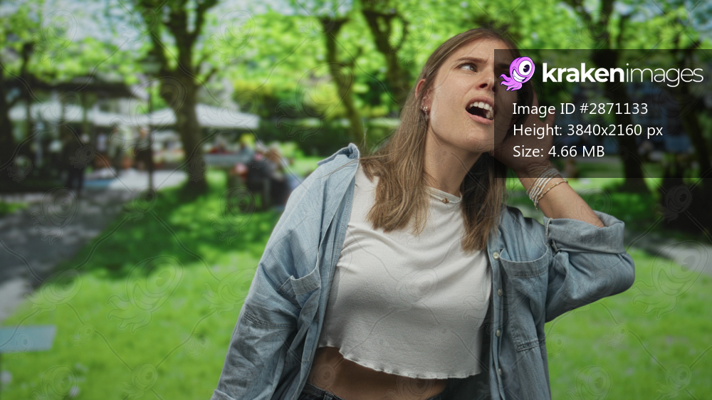 Young blonde woman shields face with hand in green forest setting under bright sunlight; discomfort.
