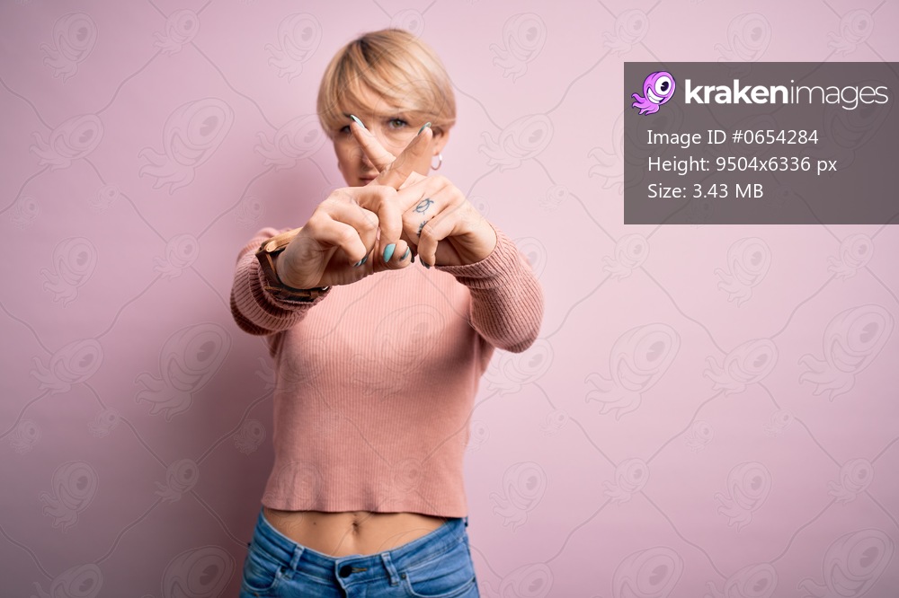 Young blonde woman with short hair wearing casual turtleneck sweater over pink background Rejection expression crossing fingers doing negative sign