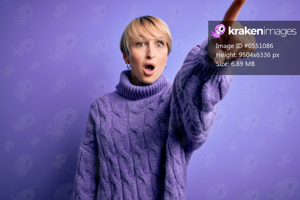 Young blonde woman with short hair wearing winter turtleneck sweater over purple background Pointing with finger surprised ahead, open mouth amazed expression, something on the front - Kraken Images