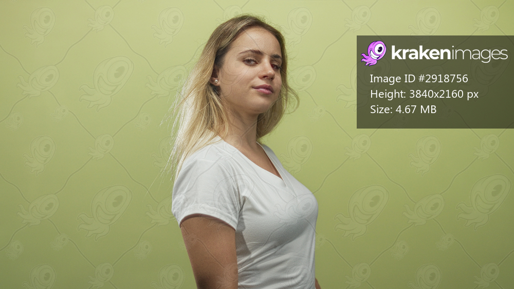 Young blonde woman with shoulder exposed and eyes closed, turning head slightly to side in light green studio; calm introspection.