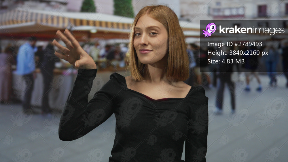 Young blonde woman with shoulder length hair finger to lips for silence at street market; secrecy hush mystery.