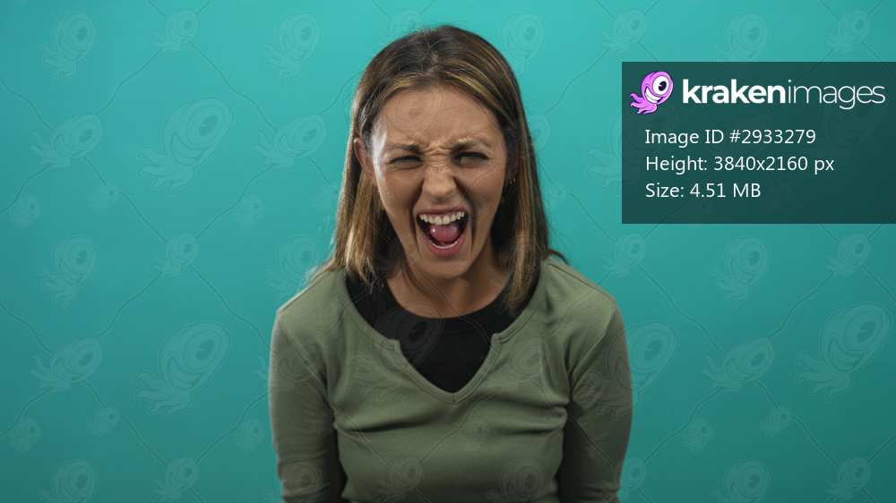 Young blonde woman shouting with mouth open and tongue out in turquoise studio; anger release catharsis.