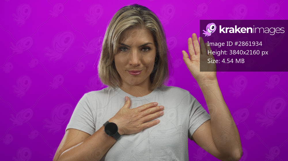 Young blonde woman showing hand on chest and raising hand in a purple studio setting; serious commitment.