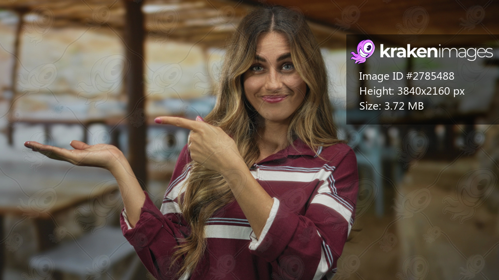 Young blonde woman showing open palm and pointing finger with smiling face in outdoor cafe; invitation welcome.