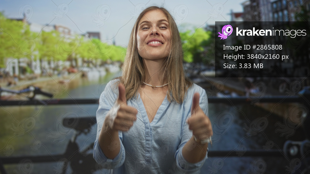 Young blonde woman showing thumbs up gesture on canal street with bicycles and boats visible; approval confidence positivity optimism.