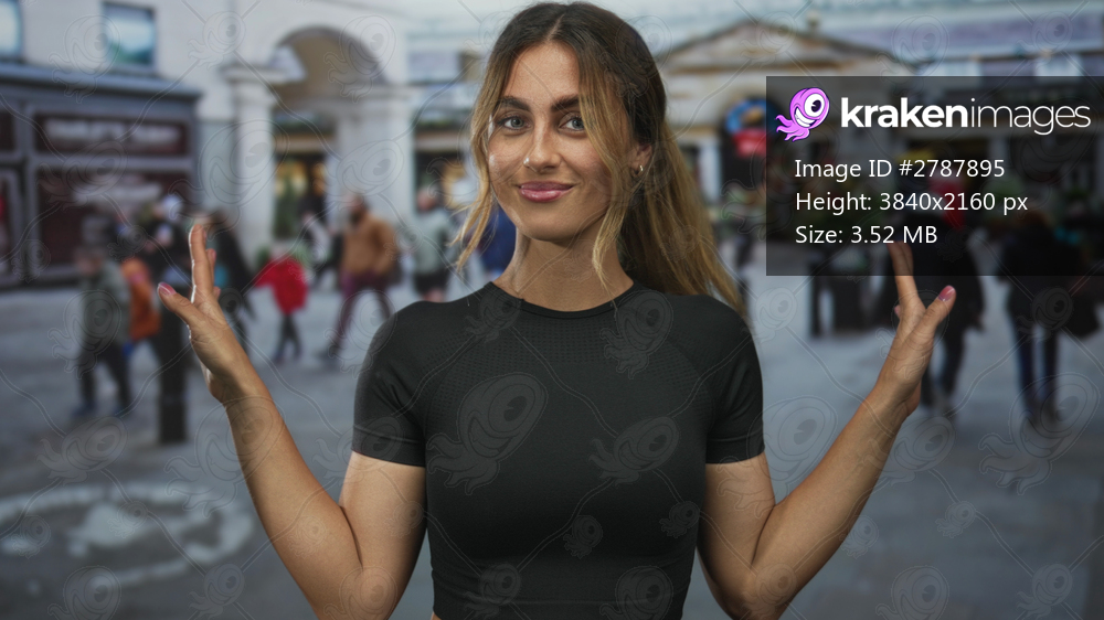 Young blonde woman shows bare arms in open palm shrug gesture in a crowded street; openness confidence.