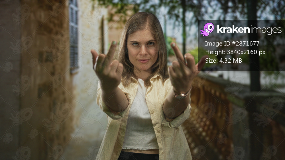 Young blonde woman shows middle finger under leafy canopy on sunlit street beside stone building facade; defiance.