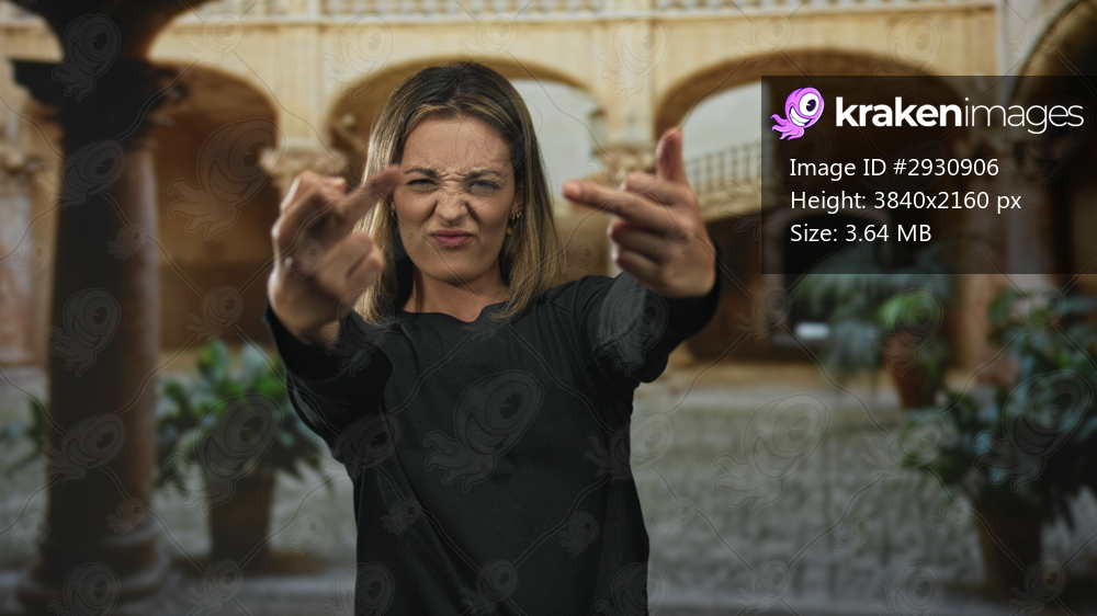 Young blonde woman shows middle fingers with scowl toward viewer in old building courtyard under stone arches; urban defiance.