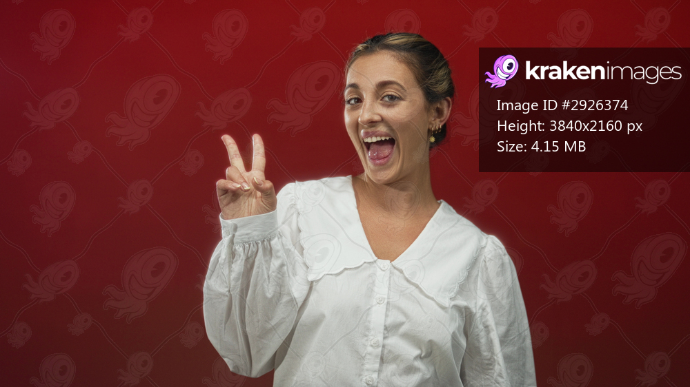Young blonde woman shows two fingers peace sign with right hand in studio against red backdrop; youthful joy.