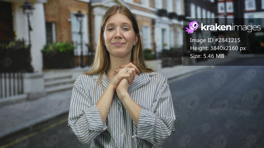 Young blonde woman shrugs arms with open palms on urban street in front of townhouses; uncertainty.