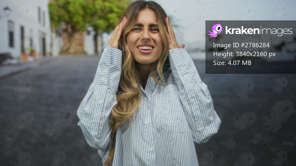 Young blonde woman shrugs palm up with right hand and squints brows in village street; indecision discomfort.