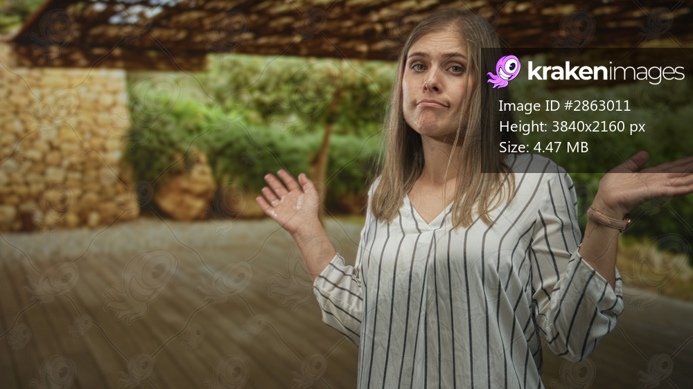 Young blonde woman shrugs shoulders with palms up on wooden deck outside a stone building; subtle confusion.