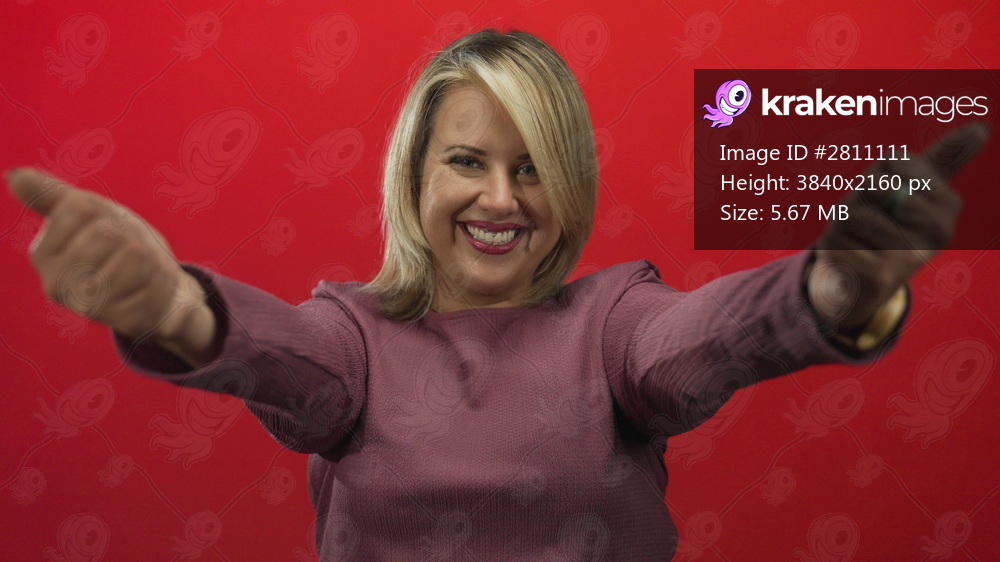 Young blonde woman smiles broadly and extends arms with hands against red studio wall; invitation joy.