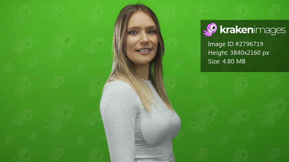 Young blonde woman smiles enthusiastically against an isolated green background, highlighting her joyful expression and casual white attire in a studio setting. - Kraken Images