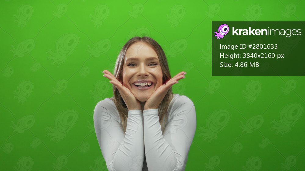 Young blonde woman smiles enthusiastically against an isolated green background, highlighting her joyful expression and casual white attire in a studio setting. - Kraken Images
