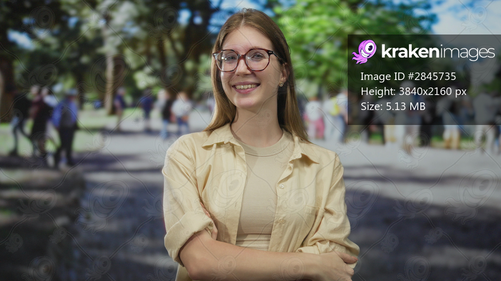 Young blonde woman smiles while touching cheek in sunlit green park outdoors with blurred crowd walking behind; serenity.