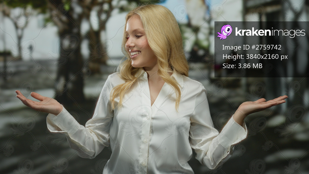 Young blonde woman smiling with arms outstretched on a sunny street in an urban city setting, embracing the positive outdoors energy.