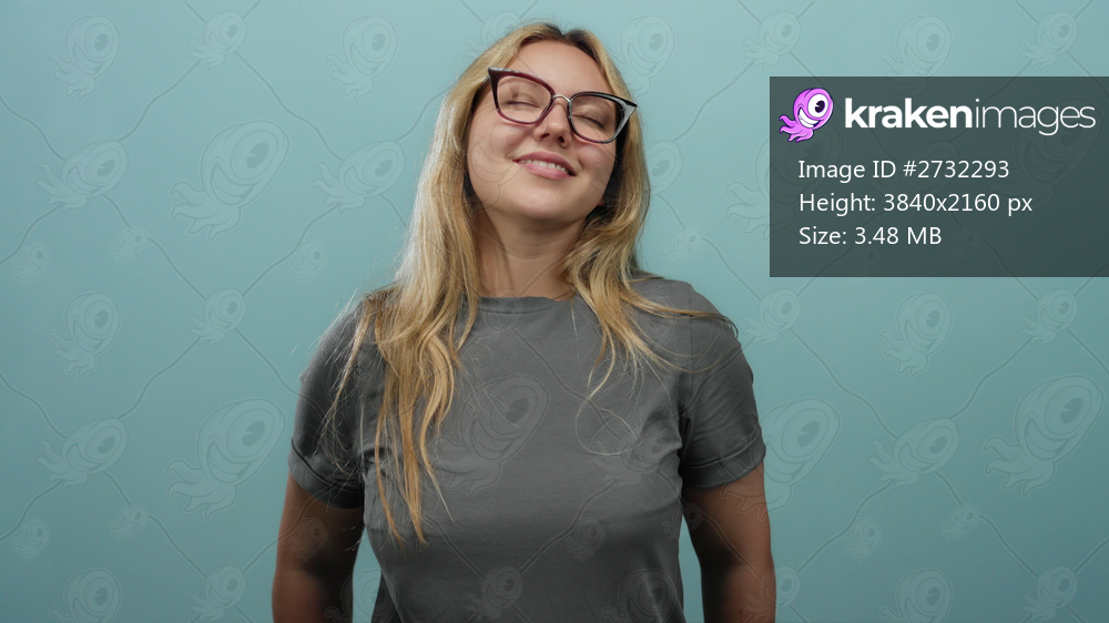 Young blonde woman smiling blissfully with eyes closed and hands clasped over her chest against an isolated blue background