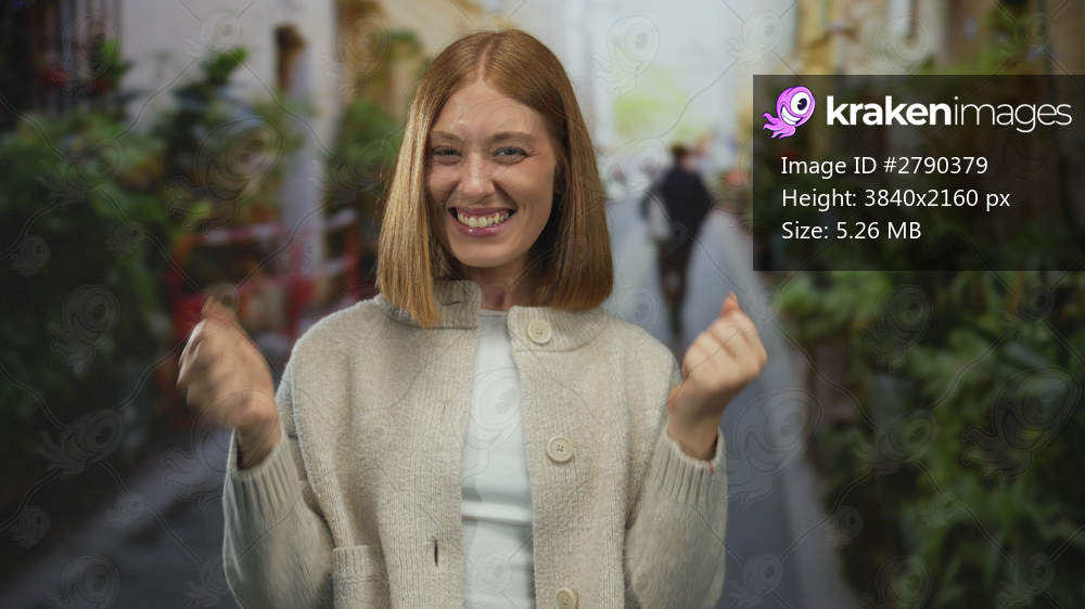 Young blonde woman smiling with fists raised in triumph on a vibrant urban street, capturing joy and excitement outdoors in a lively city setting.