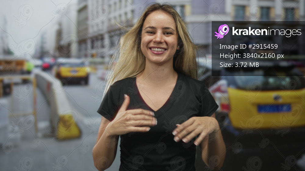 Young blonde woman smiling with hands on hips on a busy city street with taxis and barriers; confidence.