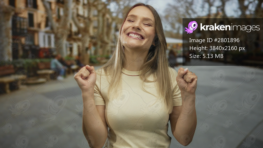 Young blonde woman smiling happily outdoors on a vibrant city street with blurred background, exuding energy and joy in an urban setting.
