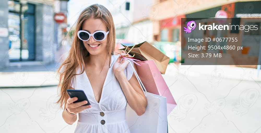 Young blonde woman smiling happy holding shopping bags and using smartphone at street of city