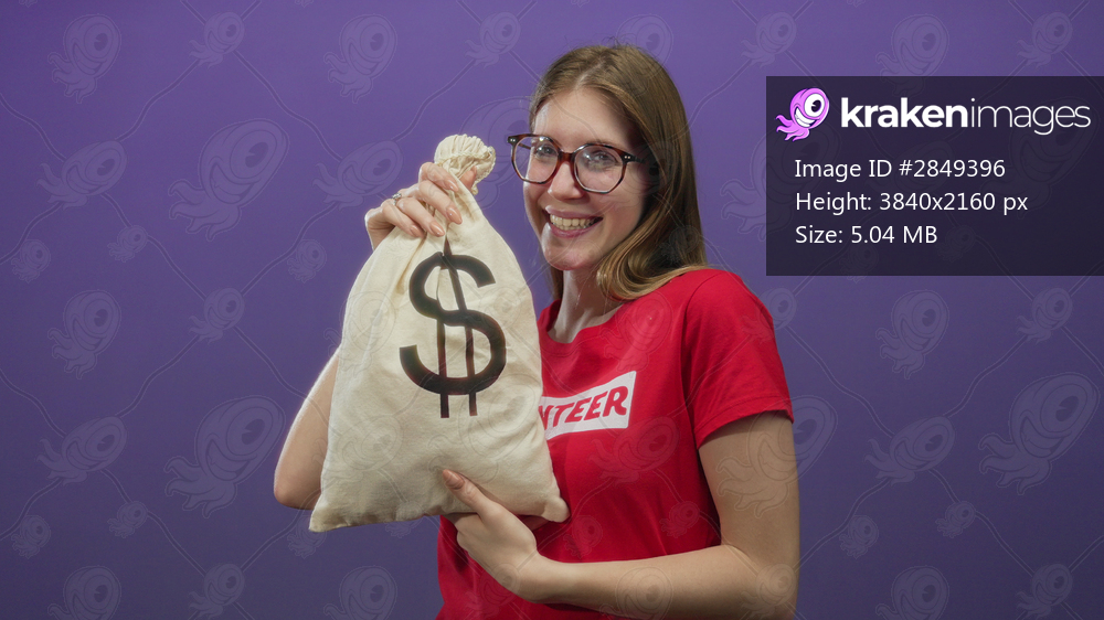 Young blonde woman smiling and holding canvas moneybag with dollar sign in studio wearing volunteer tshirt; generosity hope.