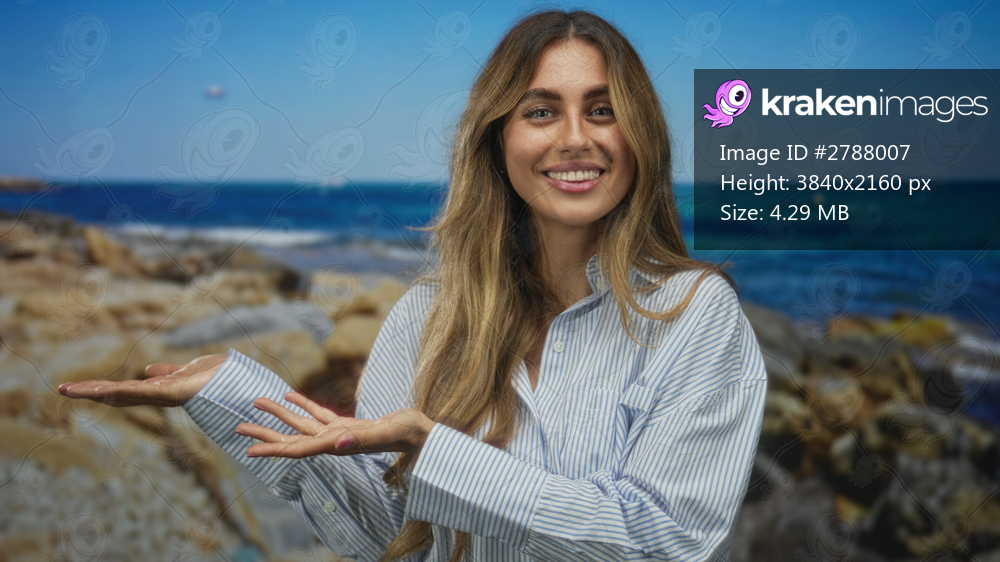 Young blonde woman smiling holds open palms at rocky seashore; invitation exploration serenity joy freedom.