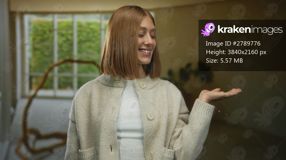 Young blonde woman smiling in a cozy hotel room, wearing a sweater, standing by a large window with a scenic garden view in the background.