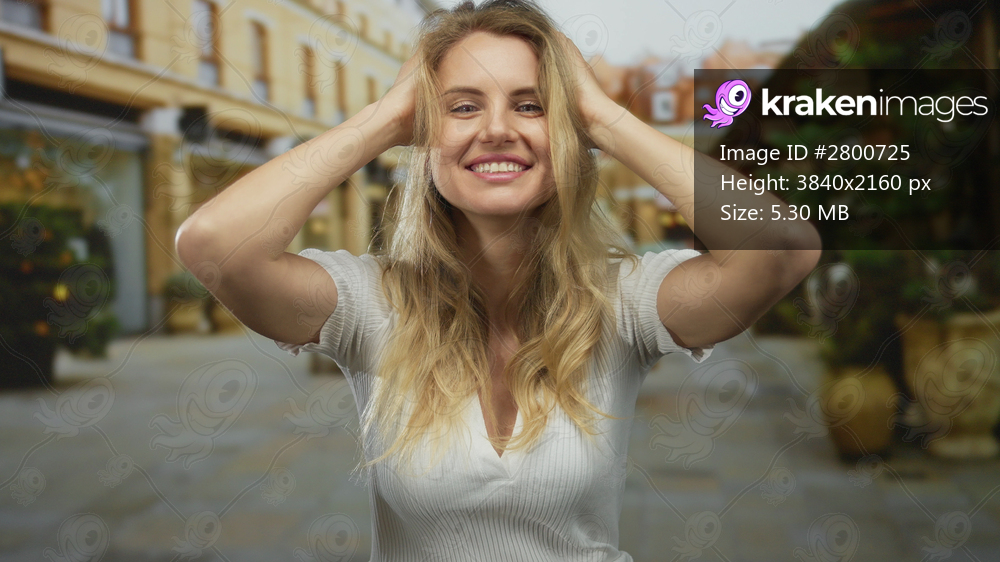 Young blonde woman smiling joyfully in an urban city street, showcasing vibrant energy and happiness outdoors, highlighting a bright, carefree vibe in a lively cityscape environment. - Kraken Images