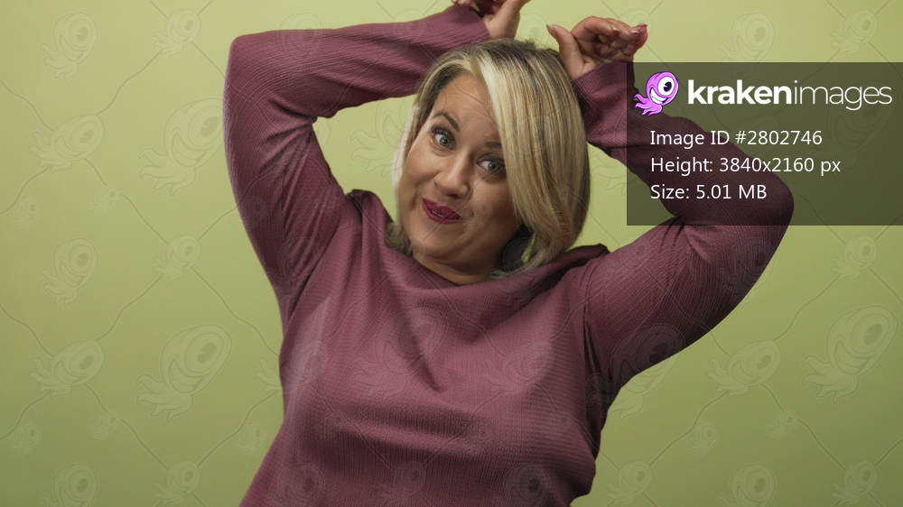 Young blonde woman smiling making ear gesture with hands in green studio; playfulness joy fun mischief.