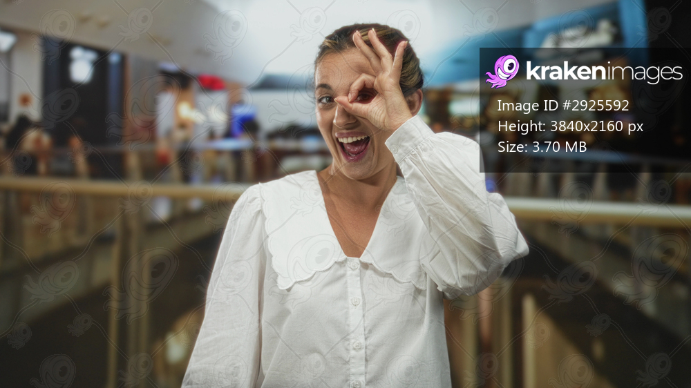 Young blonde woman smiling and making ok sign with hand to eye in a busy shopping mall building, wearing white blouse; joy discovery.
