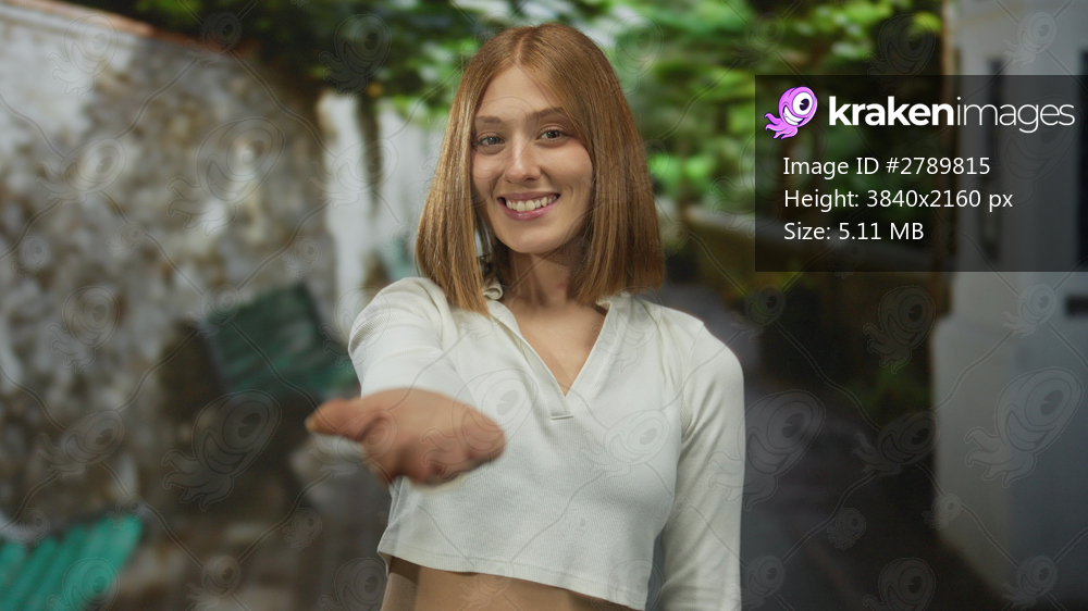 Young blonde woman smiling outdoors in a casual setting, reaching out her hand in a friendly gesture, surrounded by greenery and stone walls on a sunny day. - Kraken Images