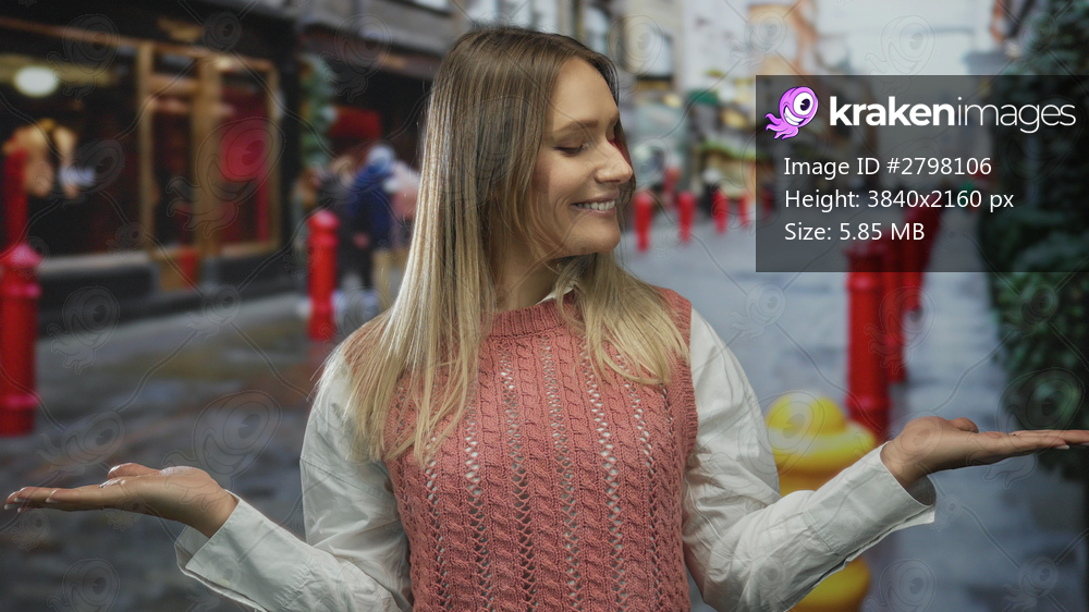 Young blonde woman smiling outdoors on a bustling city street extends arms in a decision-making gesture under sunny skies.