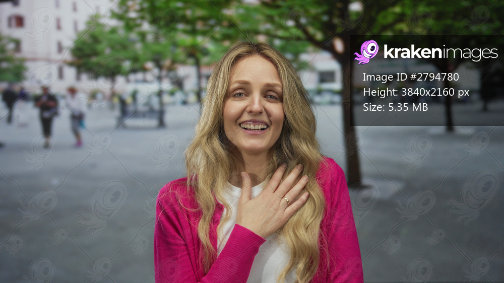 Young blonde woman smiling outdoors on a street with a vibrant pink sweater and long hair, surrounded by trees and blurred urban life in the background, exuding happiness. - Kraken Images
