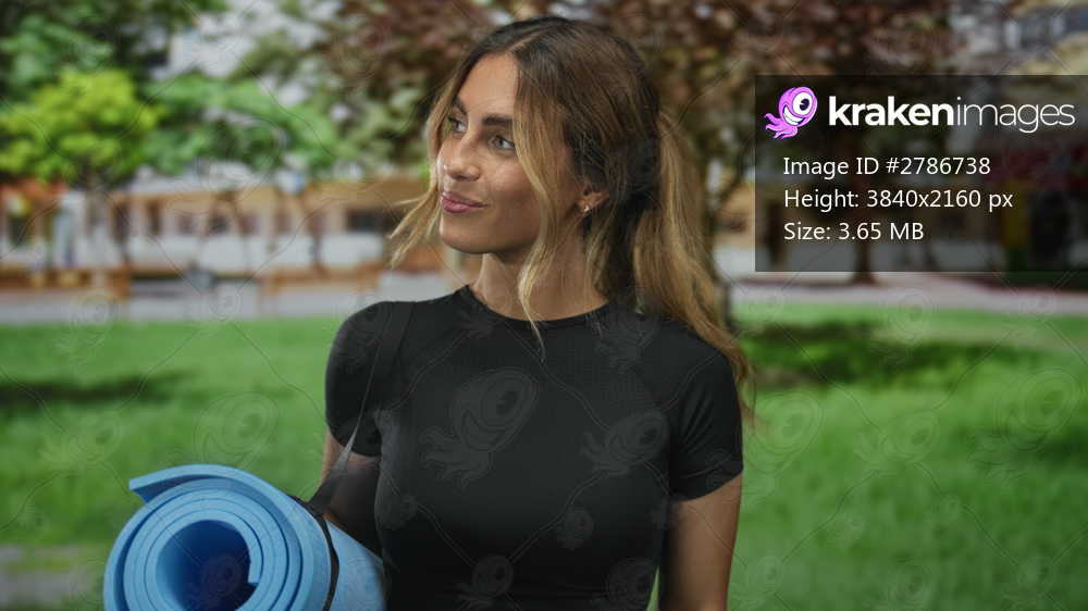 Young blonde woman smiling and pointing finger to blue yoga mat strap over shoulder in park; fitness motivation joy confidence.