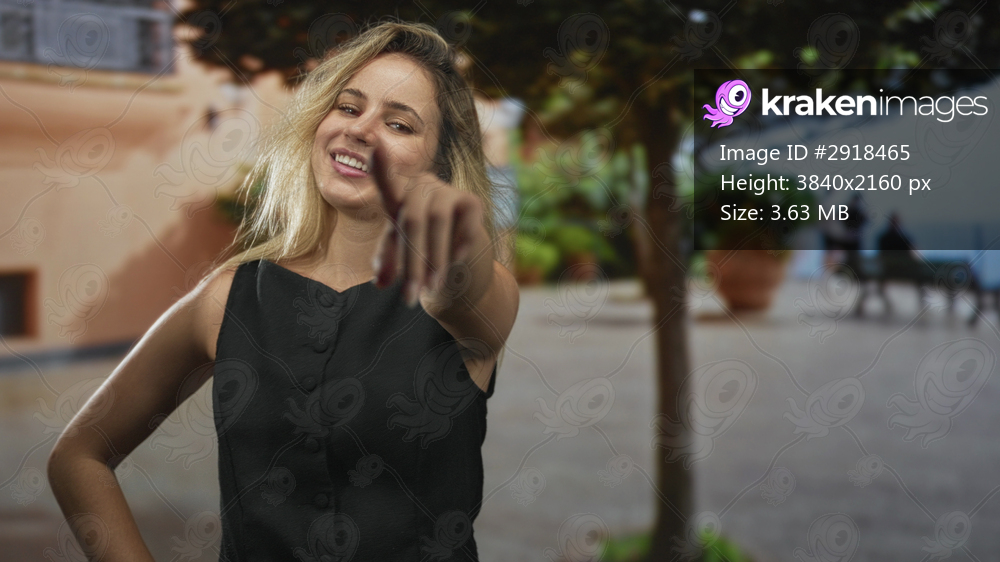 Young blonde woman smiling and pointing index finger toward camera on sunlit street near tree and bench; playful friendly confidence.