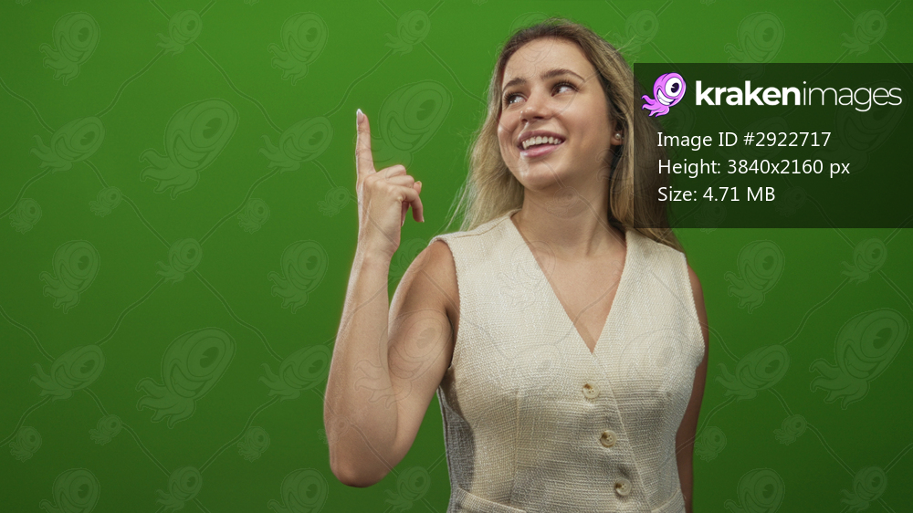 Young blonde woman smiling and pointing index finger upward while looking up, wearing a sleeveless beige vest in studio with green backdrop; optimism.