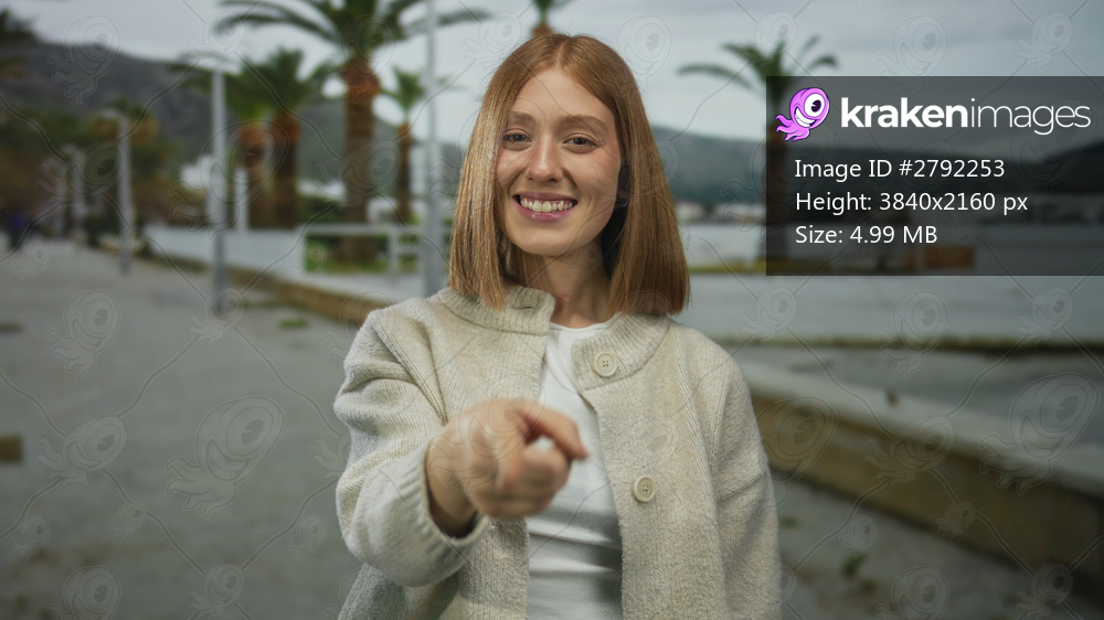 Young blonde woman smiling and pointing outdoors in an urban setting with palm trees lining the background street, creating a lively and friendly atmosphere. - Kraken Images