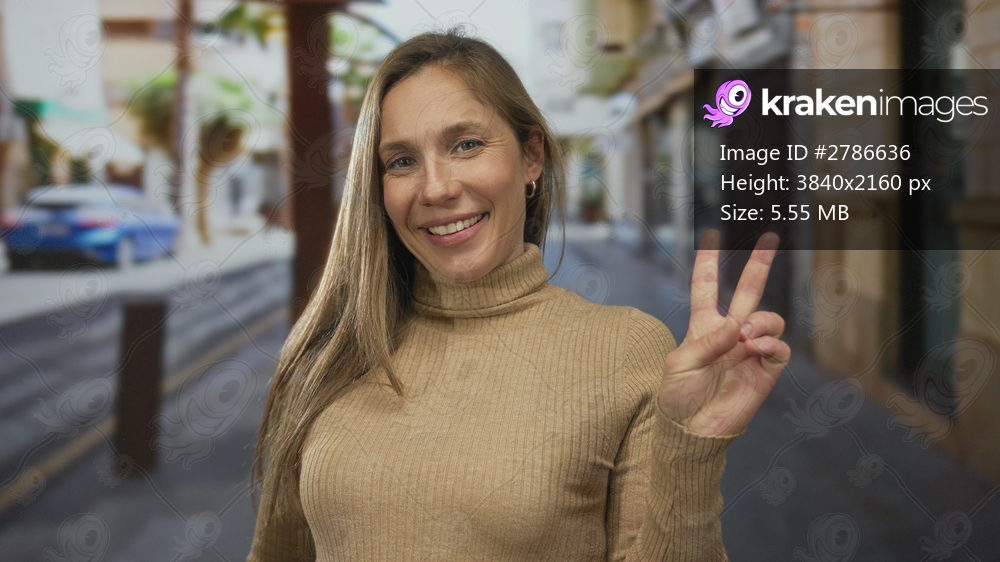 Young blonde woman smiling and showing peace sign on an urban street with blurred city background, embodying positivity and casual fashion.