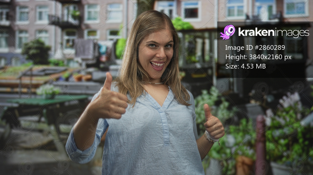 Young blonde woman smiling and showing thumbs up gesture on a street by an amsterdam canal; optimism.