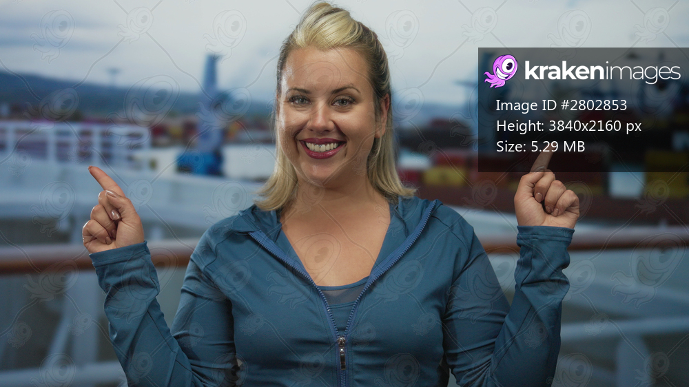 Young blonde woman smiling while pointing fingers at shipping containers on boat building; excitement.