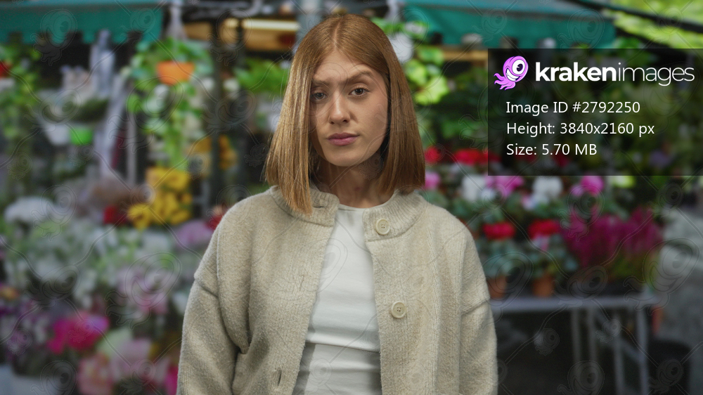 Young blonde woman standing with arms crossed at an outdoor flower shop; denial rejection annoyance.