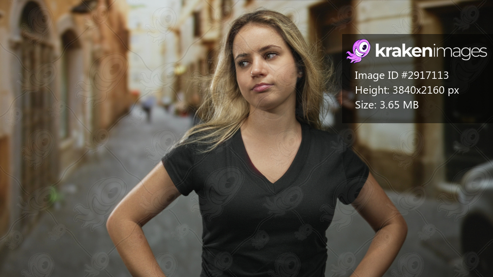 Young blonde woman standing with hands on hips and closed eyes on a narrow street with stone buildings wearing a black v neck t shirt and casual stance; annoyance stubbornness. - Kraken Images