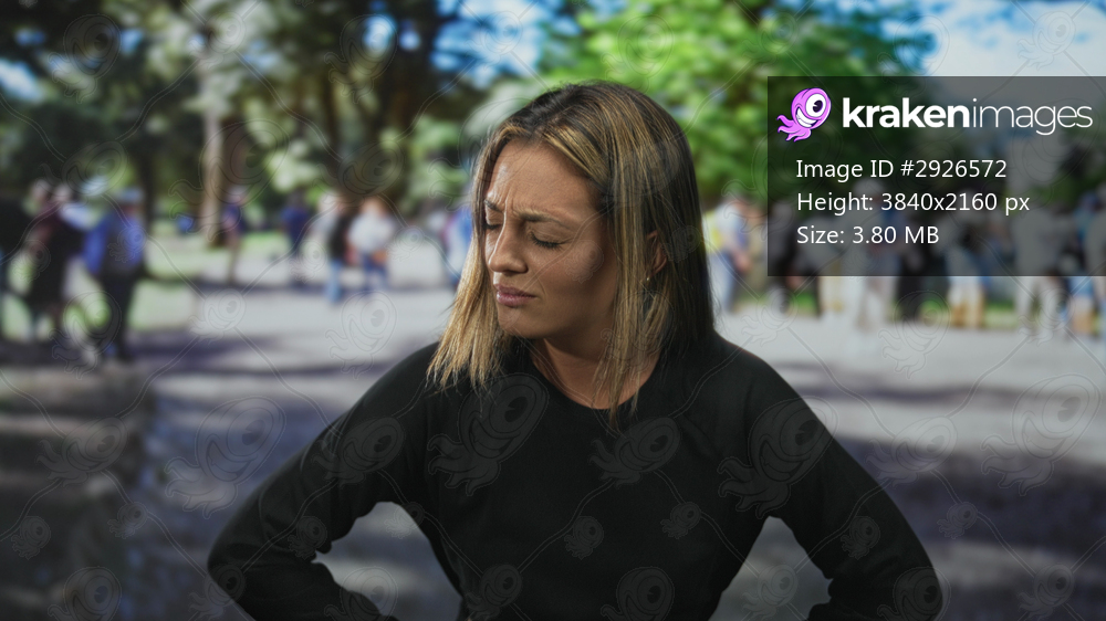Young blonde woman standing with hands on hips squinting and pressing hand to stomach on street amid blurred crowd; frustration resolve.